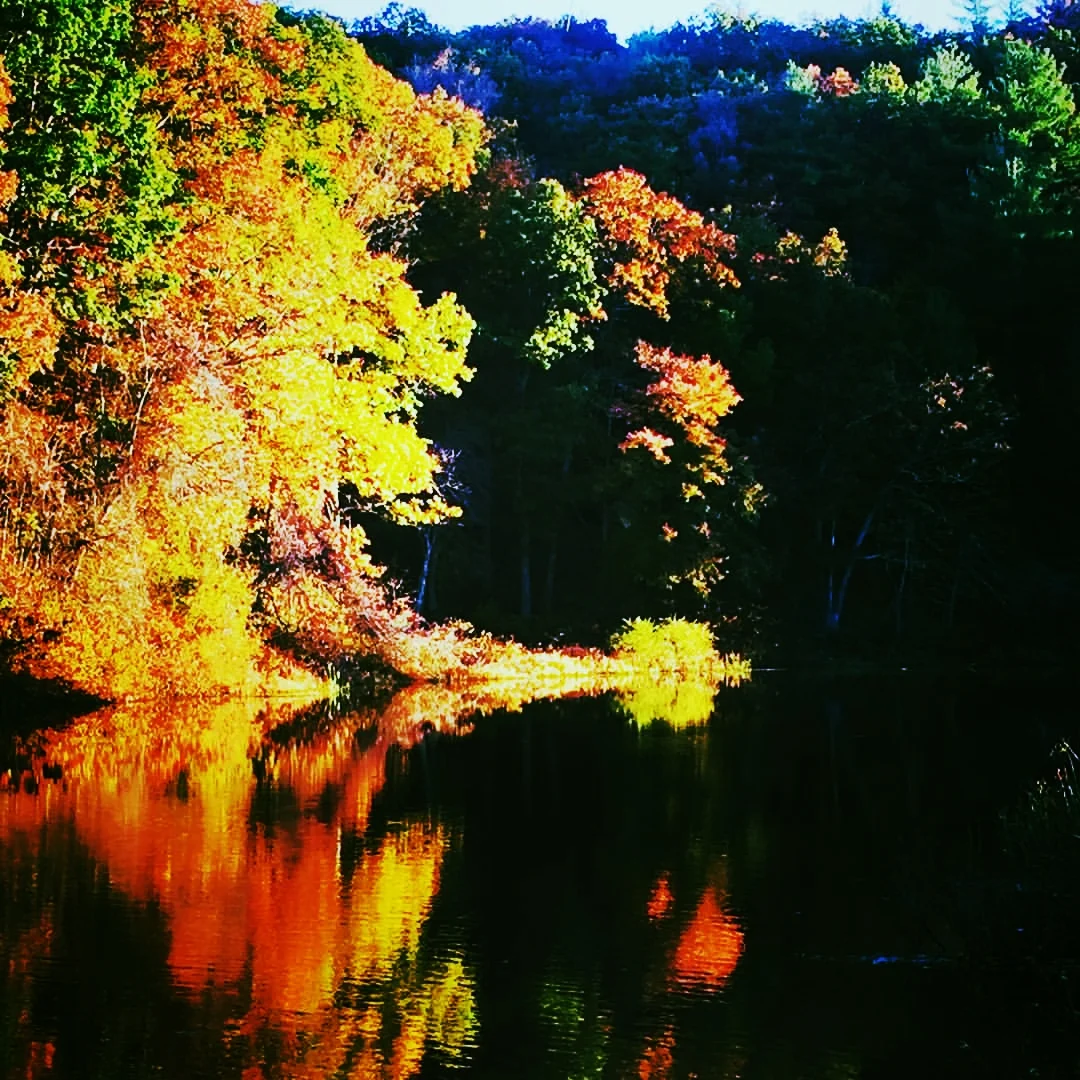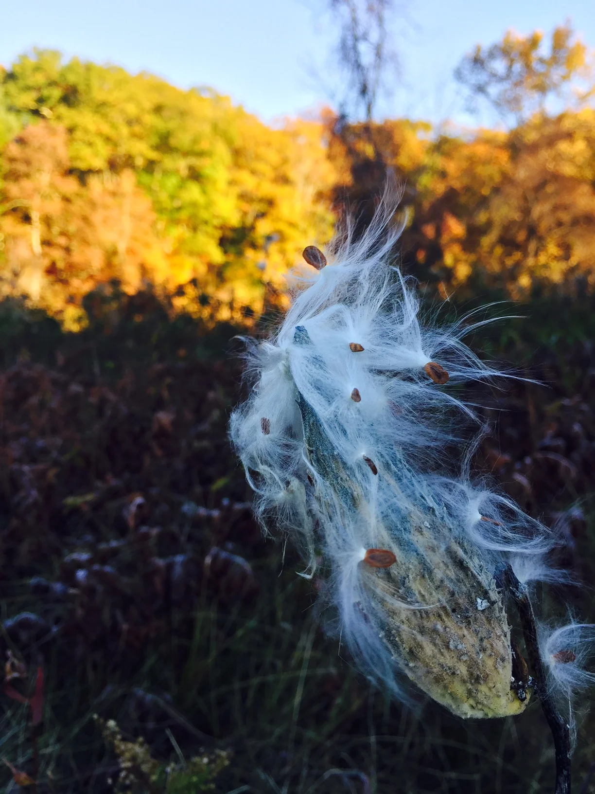 It's dark until 7:10 a.m. or so, when the sun finally rises this morning, on the day I was born; almost at the same time of day. Into the woods I walk, it's brisk and the river is black in the low light. I want to visit my father today, so he could wish me a happy birthday, as he always has. Instead I let the fiery light in the trees brighten my face as I crunch over the frost in the meadow, feeling satisfied. All the sun beaming and the yellow trees reflecting in the river are welcoming me into the world. And the milkweed is sticky with memories of being young and at play in the woods.