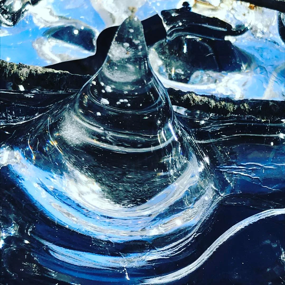 Within a half hour my boots are on my feet, the dogs are eagerly waiting, and we are at the river. A thin strip of bubbled ice edges the bright blue water of the Charles. I walk along the river, stop at the bubbling brook and listen to winter.
