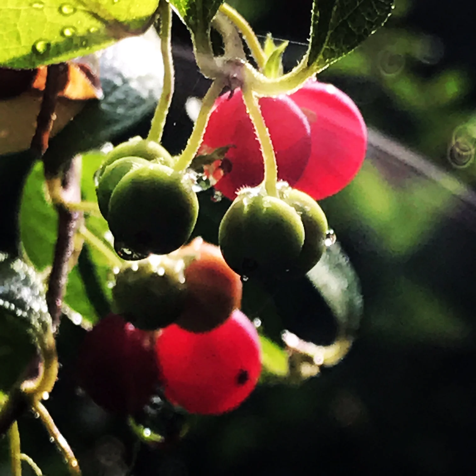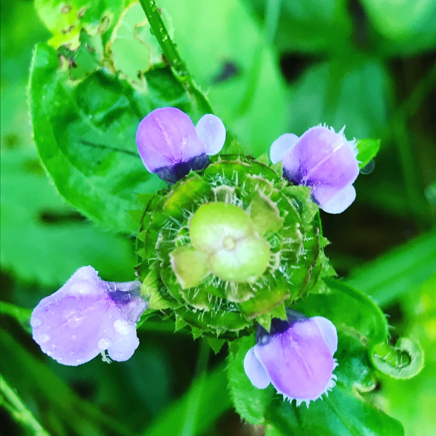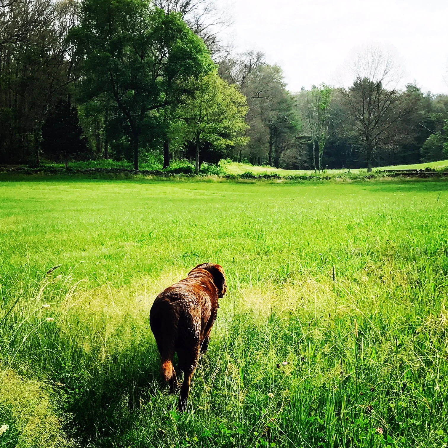 On this first day of July, it's muggy and hot. The sun beams through the trees in the woods. Then, we cross the meadow, and a light rain shower sprinkles my shoulders.