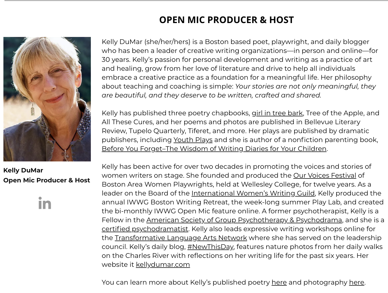 In addition to our featured writer, 15 other pre-registered writers will read their work. Each of our contributing authors will have 3 minutes to read their best expressive writing, poetry, stories, free writing, non-fiction, personal essay, memoir, reflective essay, prose, contemplative discourse, and creative non-fiction.